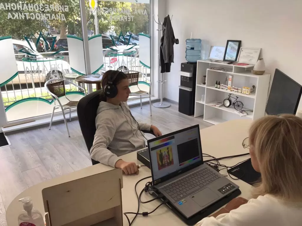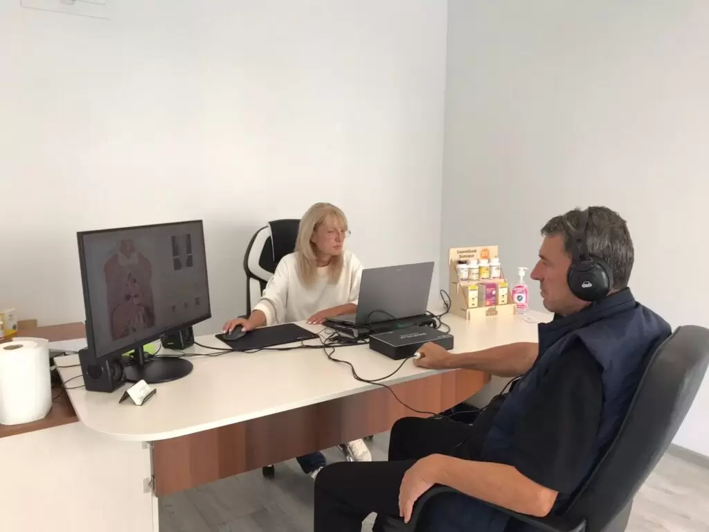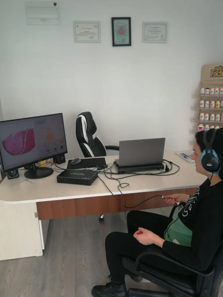 Какво усеща клиентът по време на прегледа? Просто сяда удобно в кресло, поставя слушалките и хваща сензора. Процедурата трае около 30-60 минути, през които няма неприятни усещания – някои хора дори се отпускат приятно.