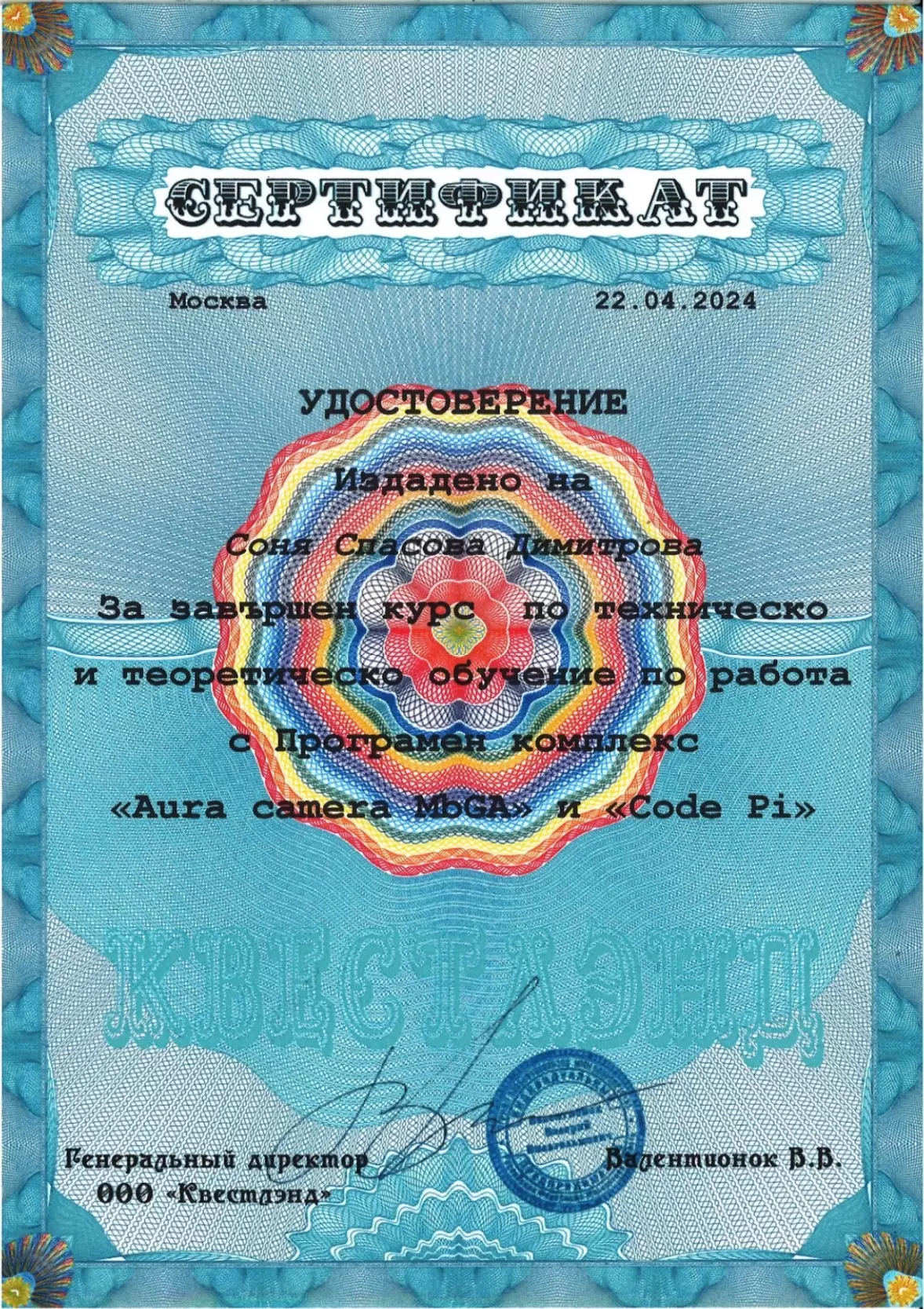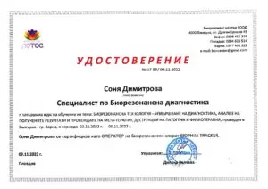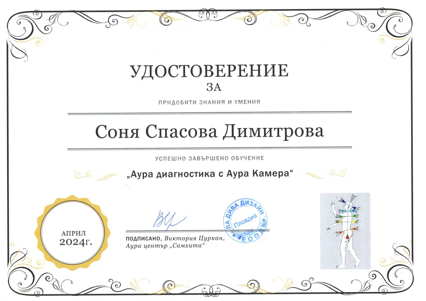 Сертификати за професионално обучение за работа с Биорезонансна апаратура и Аура камера